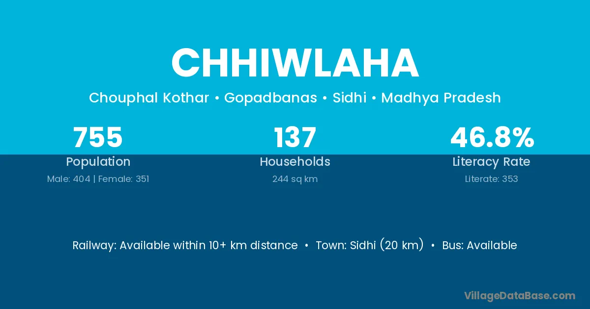Sidhi (20 km) is the nearest town to Chhiwlaha village for major economic activities and is located approximately 20 km away.