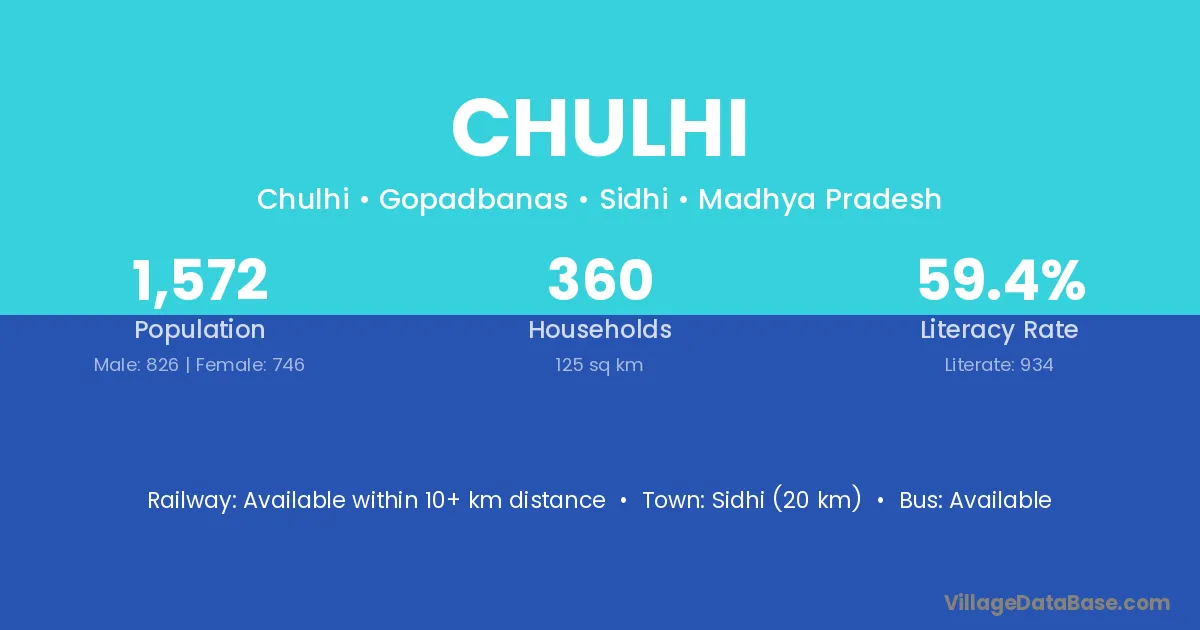 Sidhi (20 km) is the nearest town to Chulhi village for major economic activities and is located approximately 20 km away.