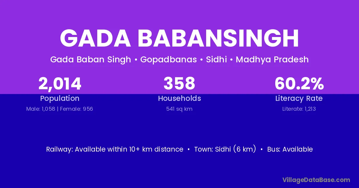 Sidhi (6 km) is the nearest town to Gada Babansingh village for major economic activities and is located approximately 6 km away.