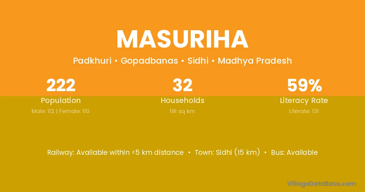 Sidhi (15 km) is the nearest town to Masuriha village for major economic activities and is located approximately 15 km away.
