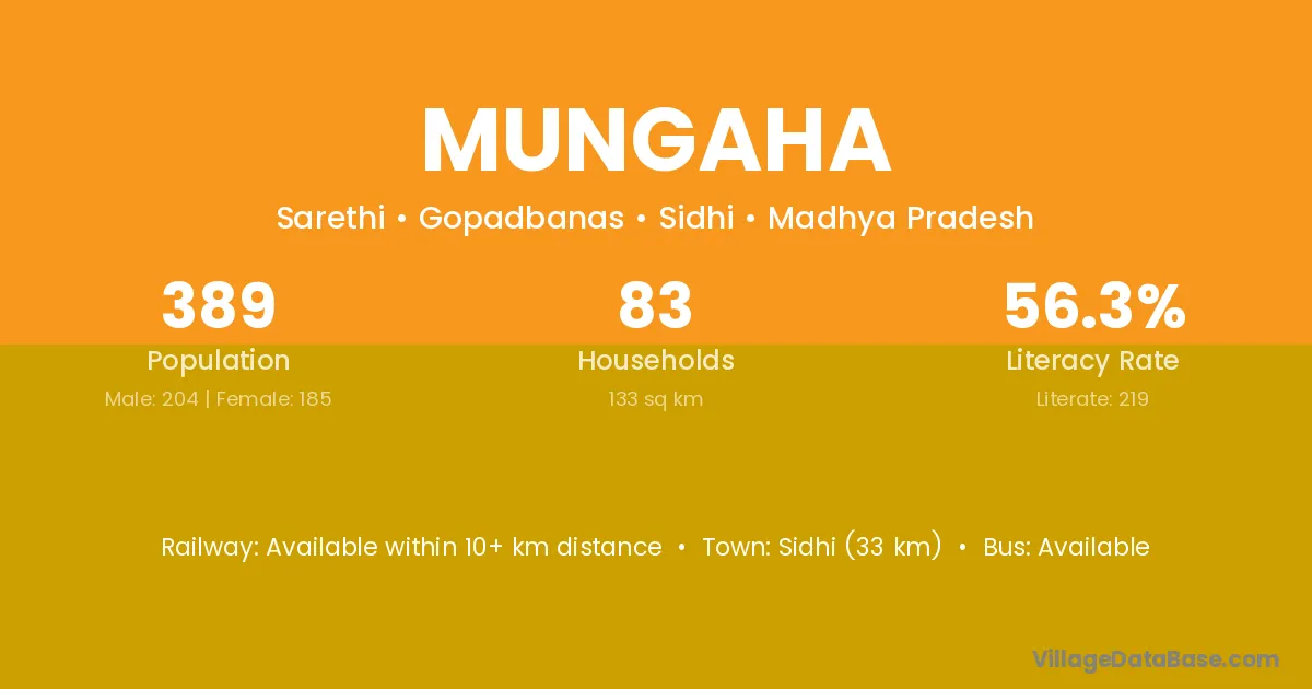 Sidhi (33 km) is the nearest town to Mungaha village for major economic activities and is located approximately 33 km away.