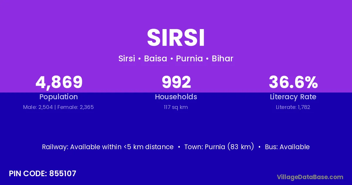 The literacy rate of Sirsi village is 43.21%. Male literacy stands at 51.29% and female literacy at 34.65%.