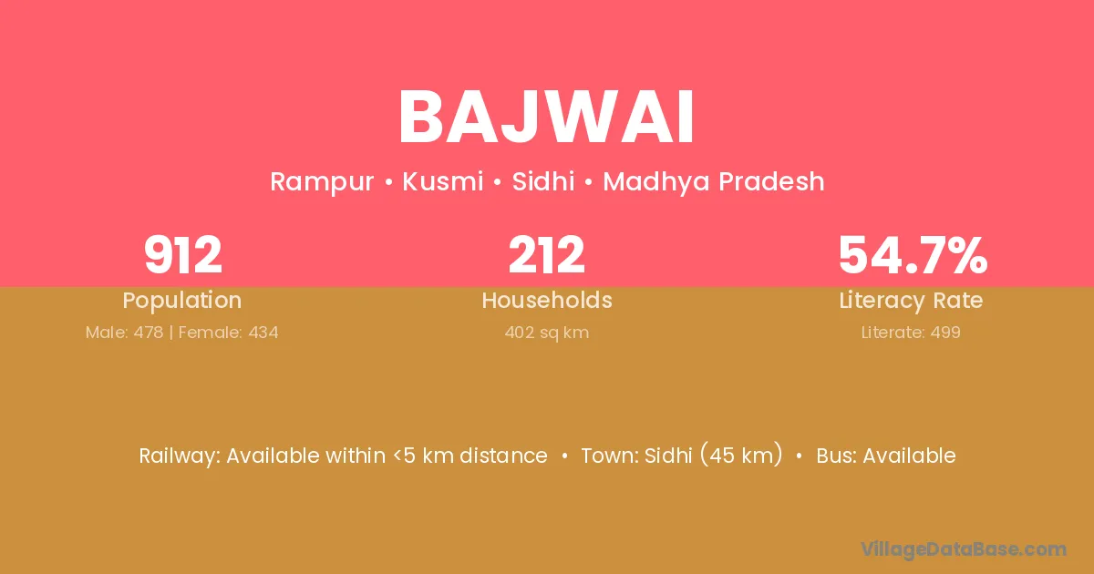 Sidhi (45 km) is the nearest town to Bajwai village for major economic activities and is located approximately 45 km away.