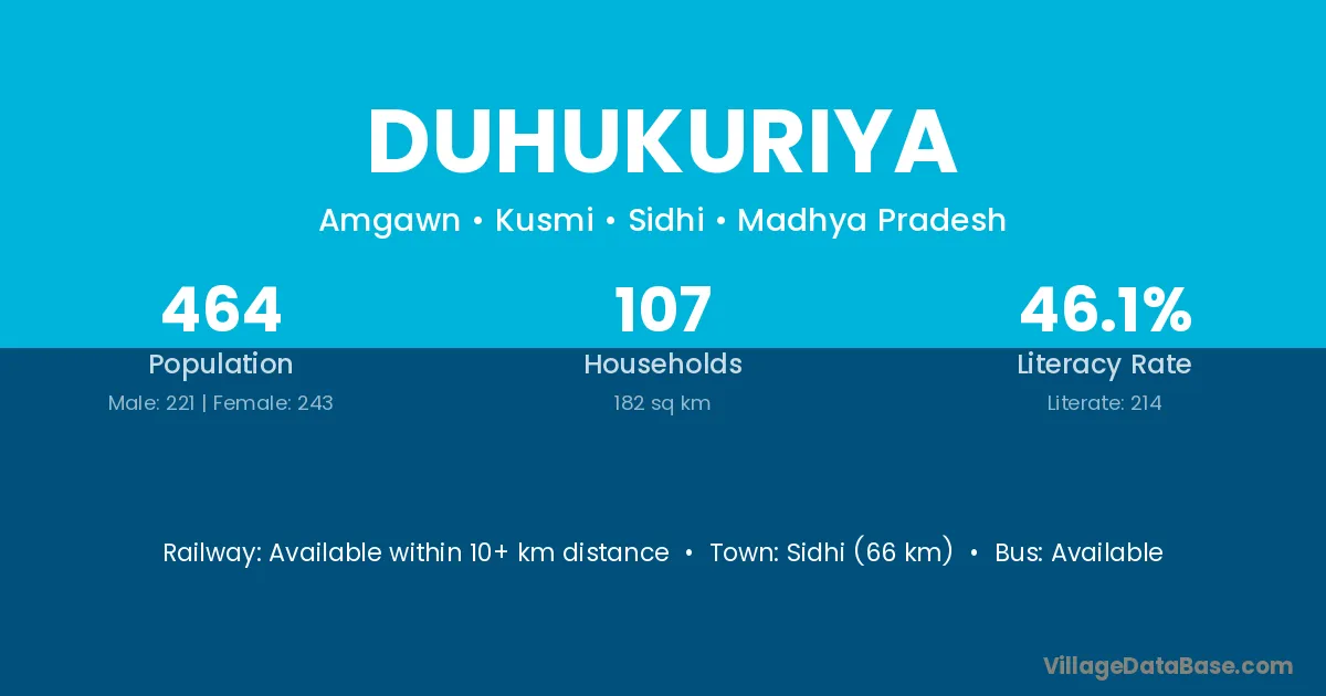 Sidhi (66 km) is the nearest town to Duhukuriya village for major economic activities and is located approximately 66 km away.