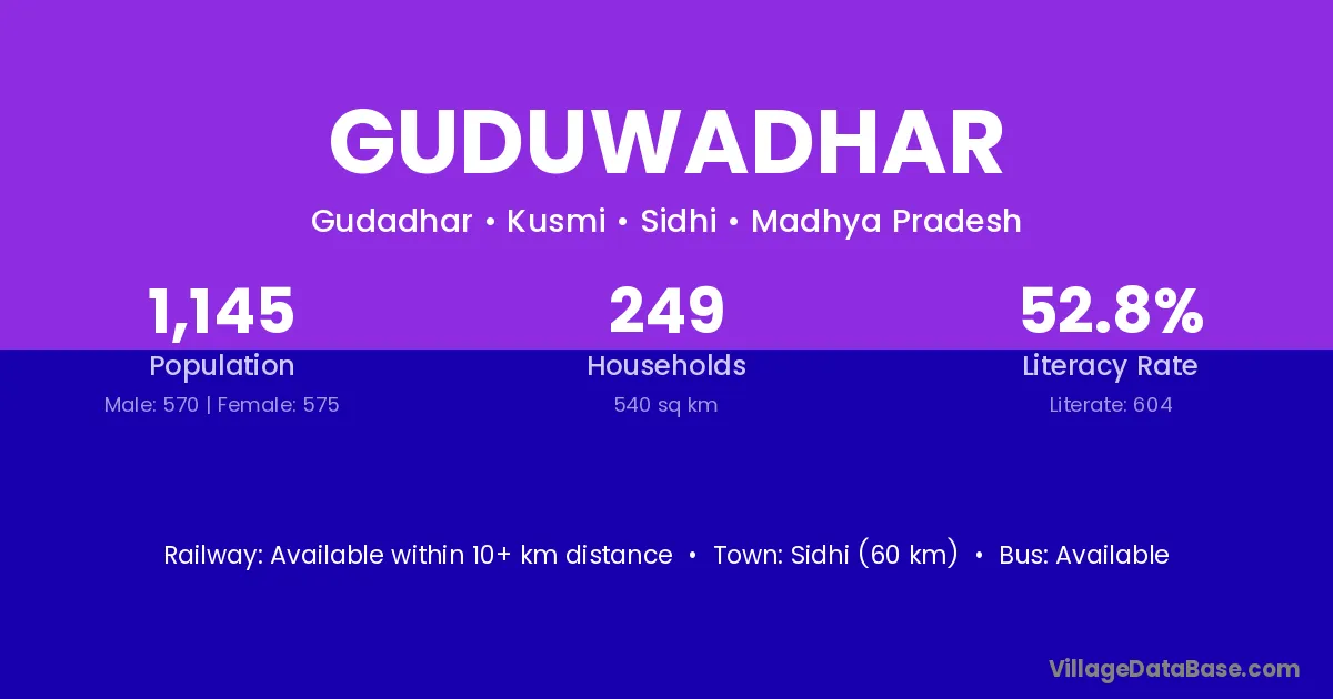 Sidhi (60 km) is the nearest town to Guduwadhar village for major economic activities and is located approximately 60 km away.