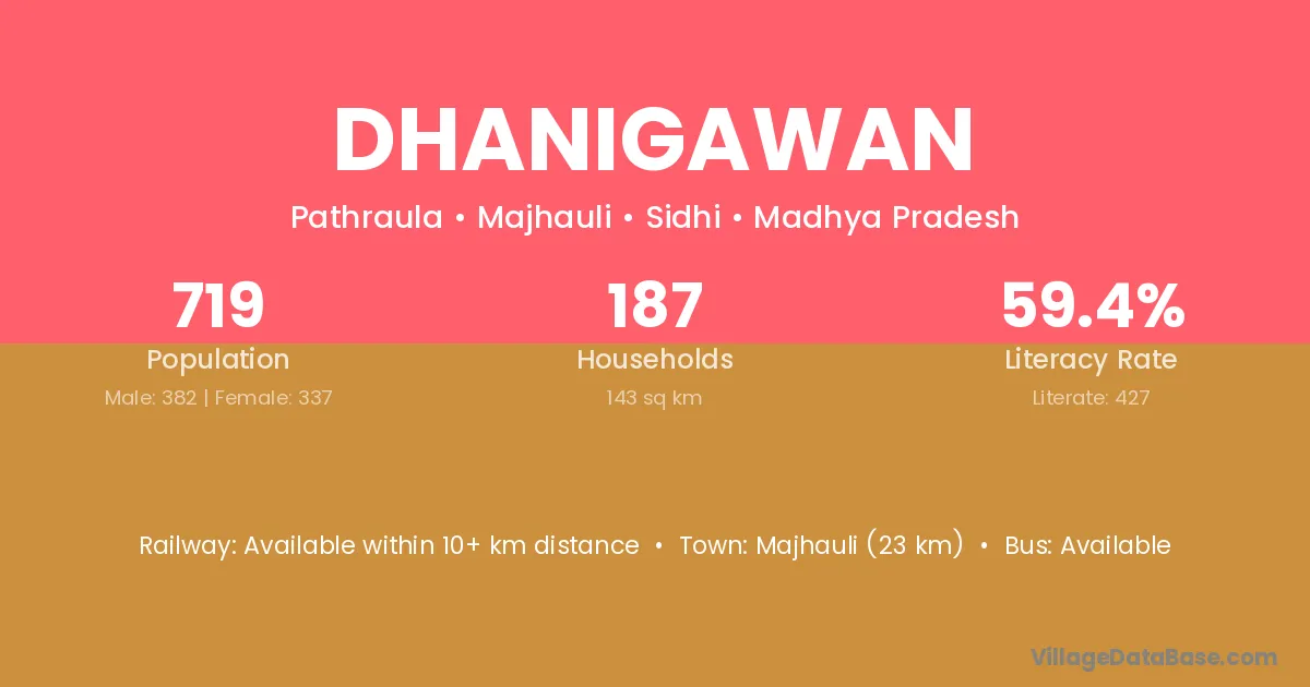 Dhanigawan village has a total population of 719 people, of which 382 are males and 337 are females.