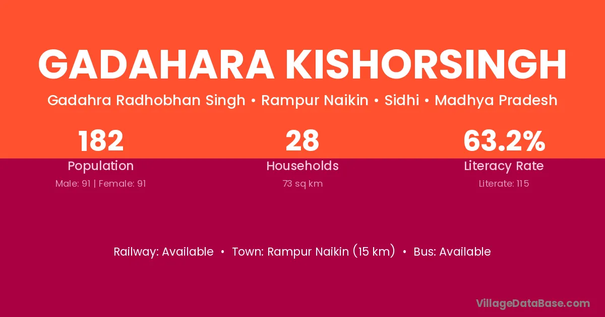 Gadahara Kishorsingh village has a total population of 182 people, of which 91 are males and 91 are females.