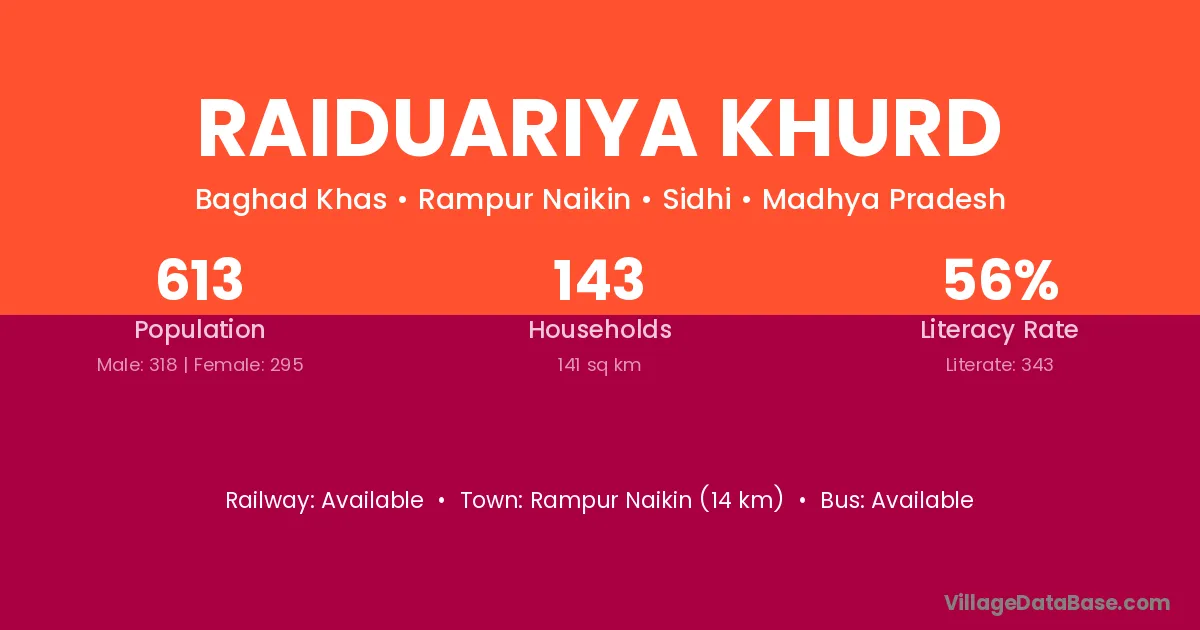 Raiduariya Khurd village has a total population of 613 people, of which 318 are males and 295 are females.