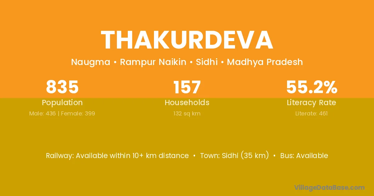 Sidhi (35 km) is the nearest town to Thakurdeva village for major economic activities and is located approximately 35 km away.