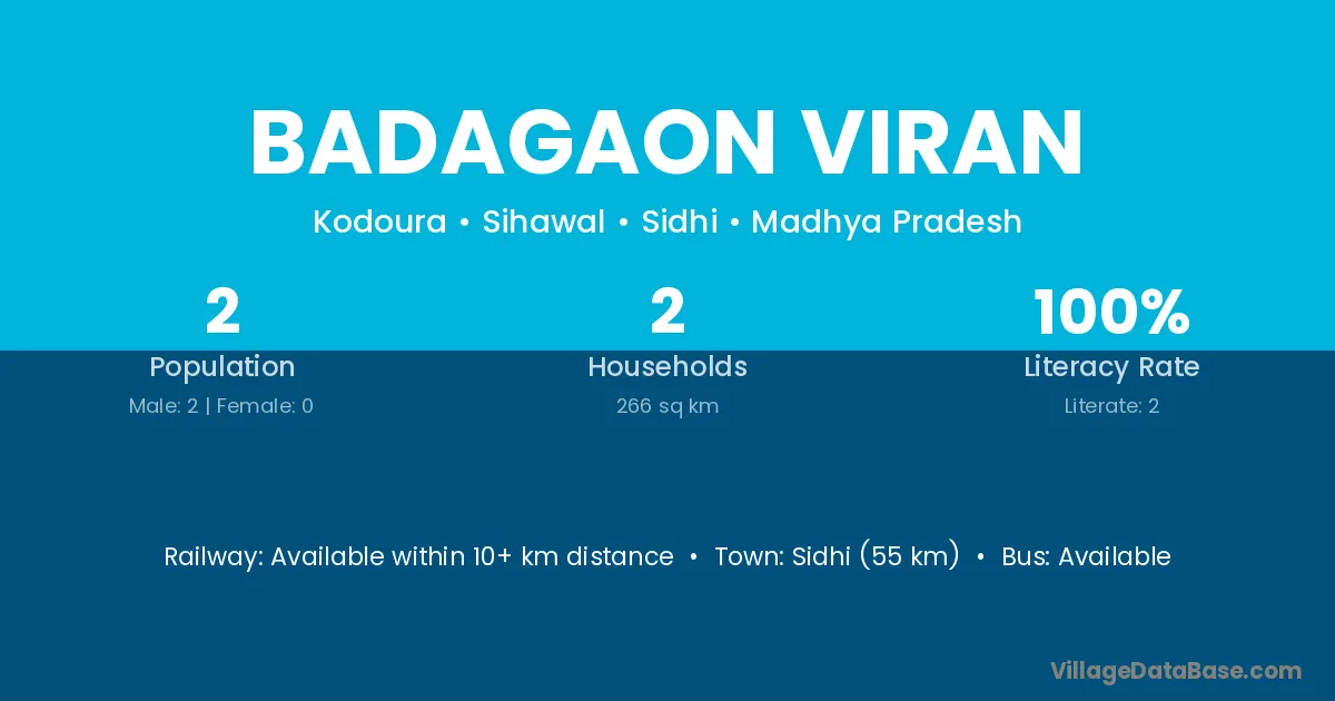 Sidhi (55 km) is the nearest town to Badagaon Viran village for major economic activities and is located approximately 55 km away.