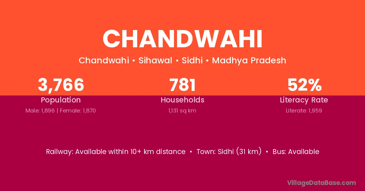 Sidhi (31 km) is the nearest town to Chandwahi village for major economic activities and is located approximately 31 km away.