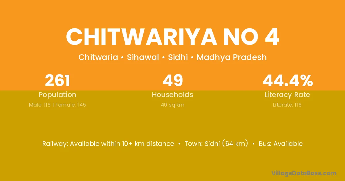 Sidhi (64 km) is the nearest town to Chitwariya No 4 village for major economic activities and is located approximately 64 km away.