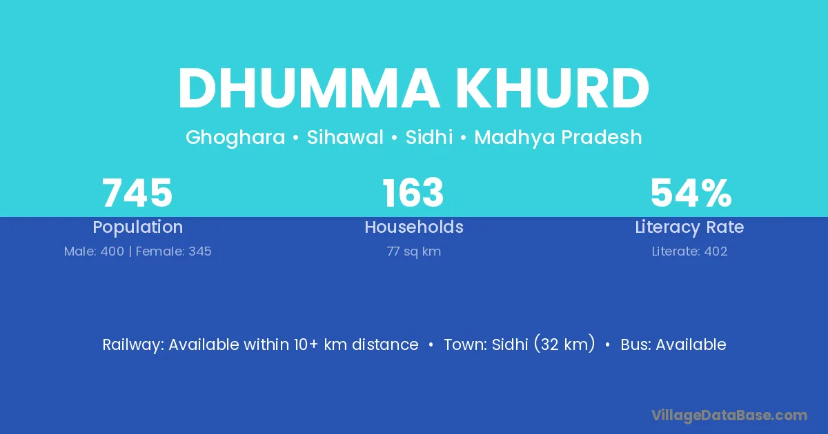 Sidhi (32 km) is the nearest town to Dhumma Khurd village for major economic activities and is located approximately 32 km away.