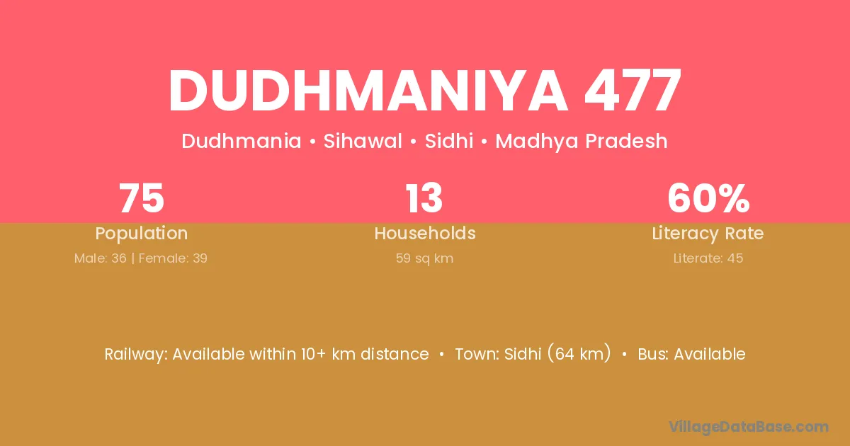 Sidhi (64 km) is the nearest town to Dudhmaniya 477 village for major economic activities and is located approximately 64 km away.