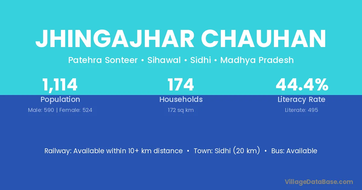 Sidhi (20 km) is the nearest town to Jhingajhar Chauhan village for major economic activities and is located approximately 20 km away.