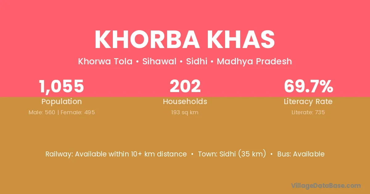 Sidhi (35 km) is the nearest town to Khorba Khas village for major economic activities and is located approximately 35 km away.