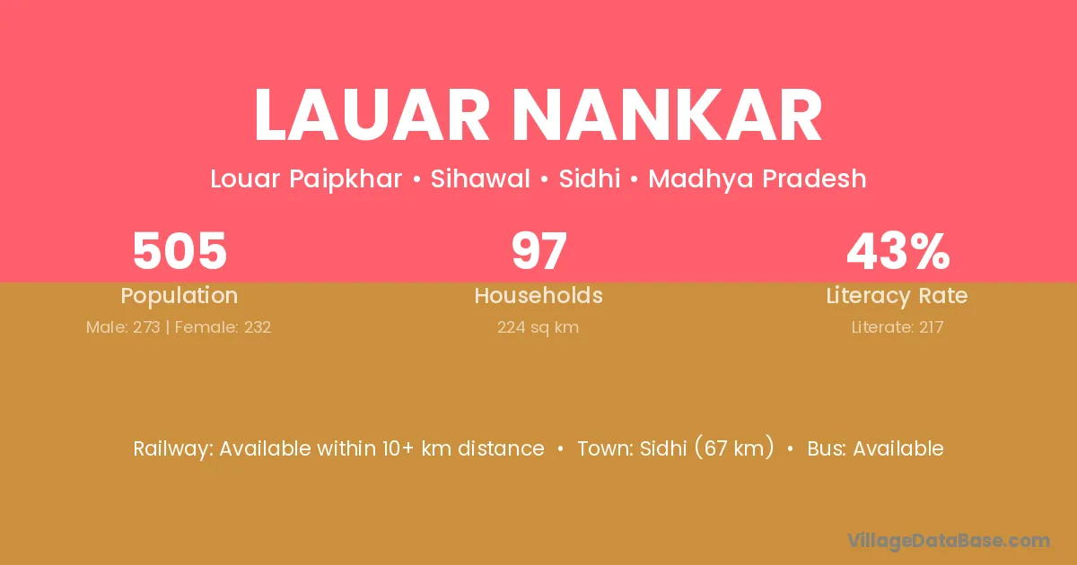 Sidhi (67 km) is the nearest town to Lauar Nankar village for major economic activities and is located approximately 67 km away.