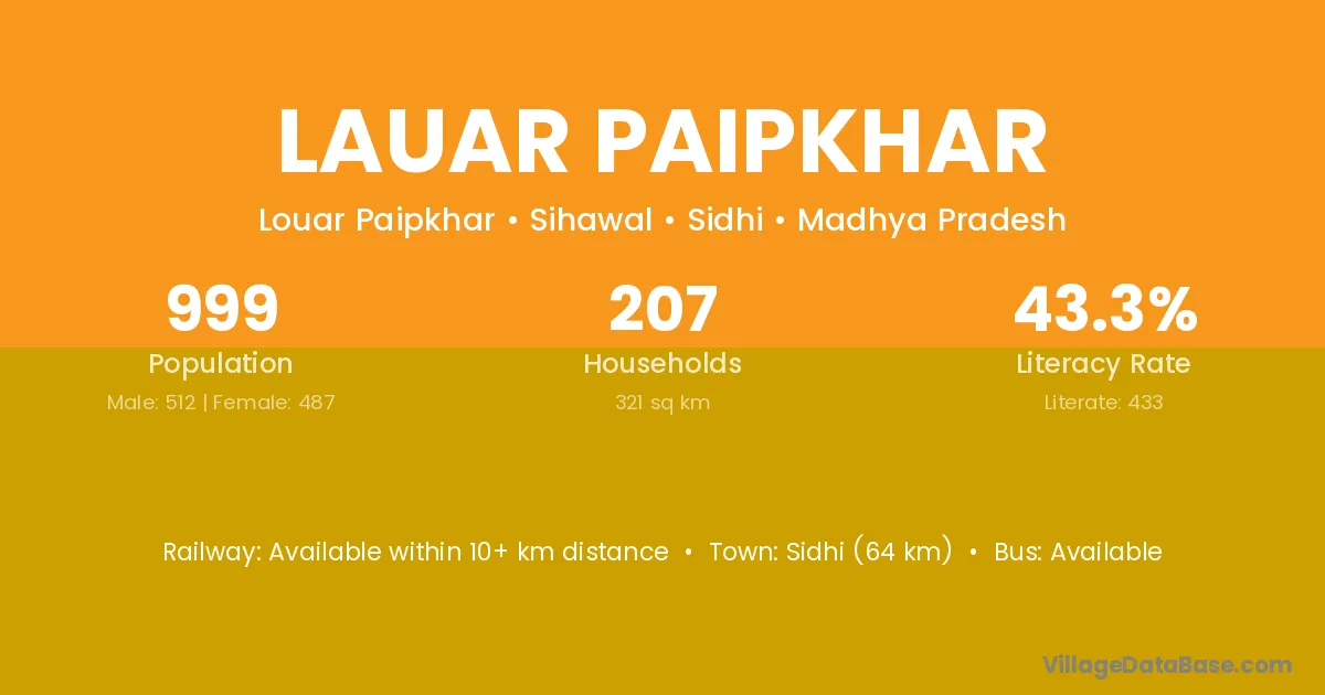 Sidhi (64 km) is the nearest town to Lauar Paipkhar village for major economic activities and is located approximately 64 km away.