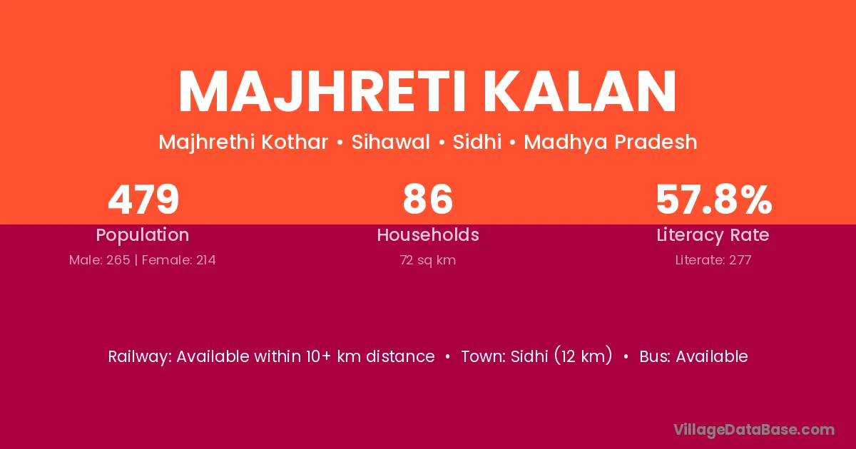 Sidhi (12 km) is the nearest town to Majhreti Kalan village for major economic activities and is located approximately 12 km away.