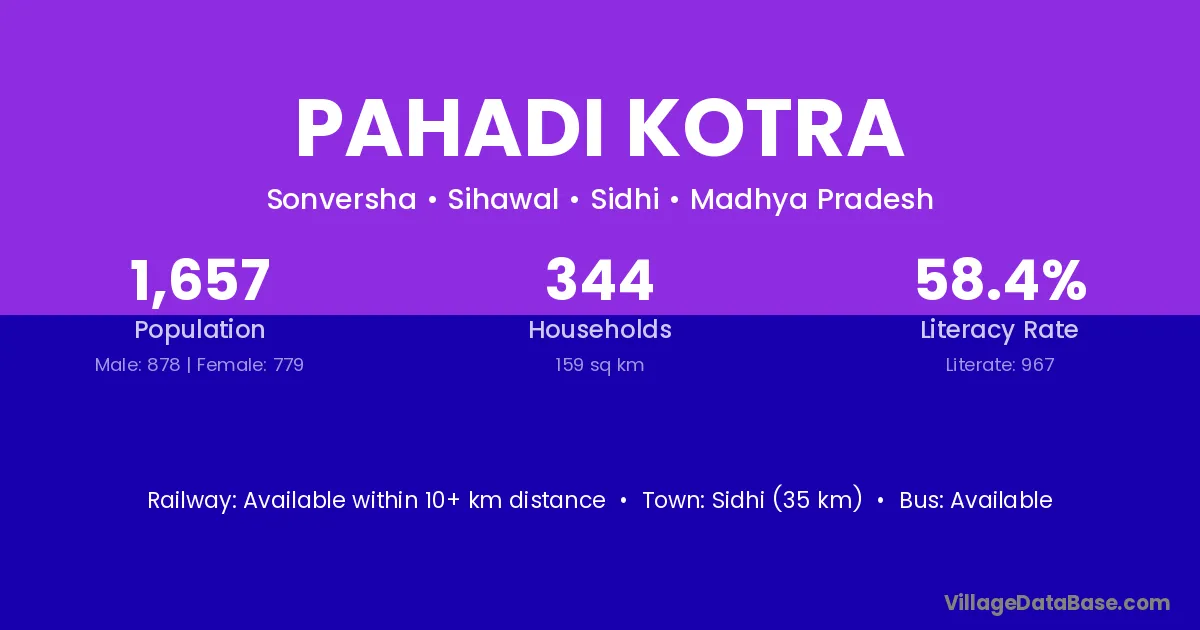 Sidhi (35 km) is the nearest town to Pahadi Kotra village for major economic activities and is located approximately 35 km away.