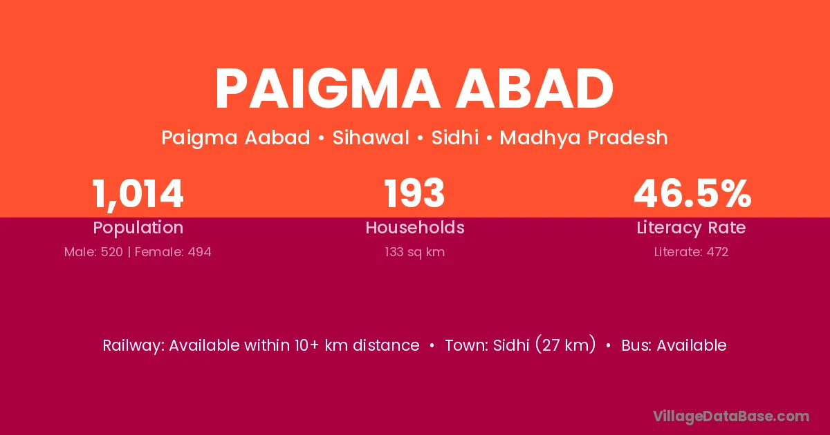 Sidhi (27 km) is the nearest town to Paigma Abad village for major economic activities and is located approximately 27 km away.