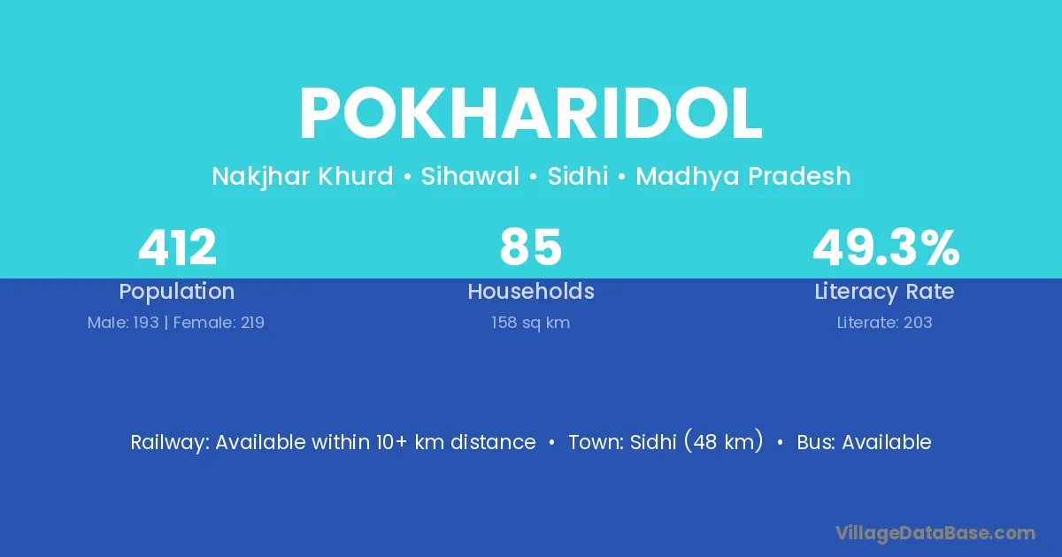 Sidhi (48 km) is the nearest town to Pokharidol village for major economic activities and is located approximately 48 km away.