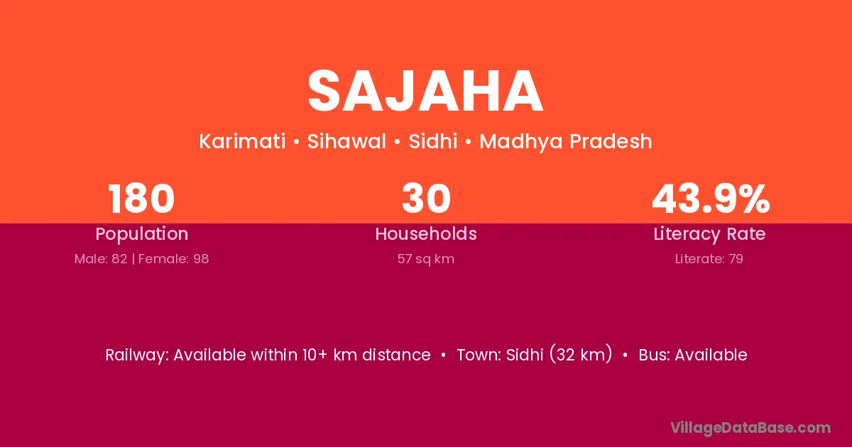Sidhi (32 km) is the nearest town to Sajaha village for major economic activities and is located approximately 32 km away.