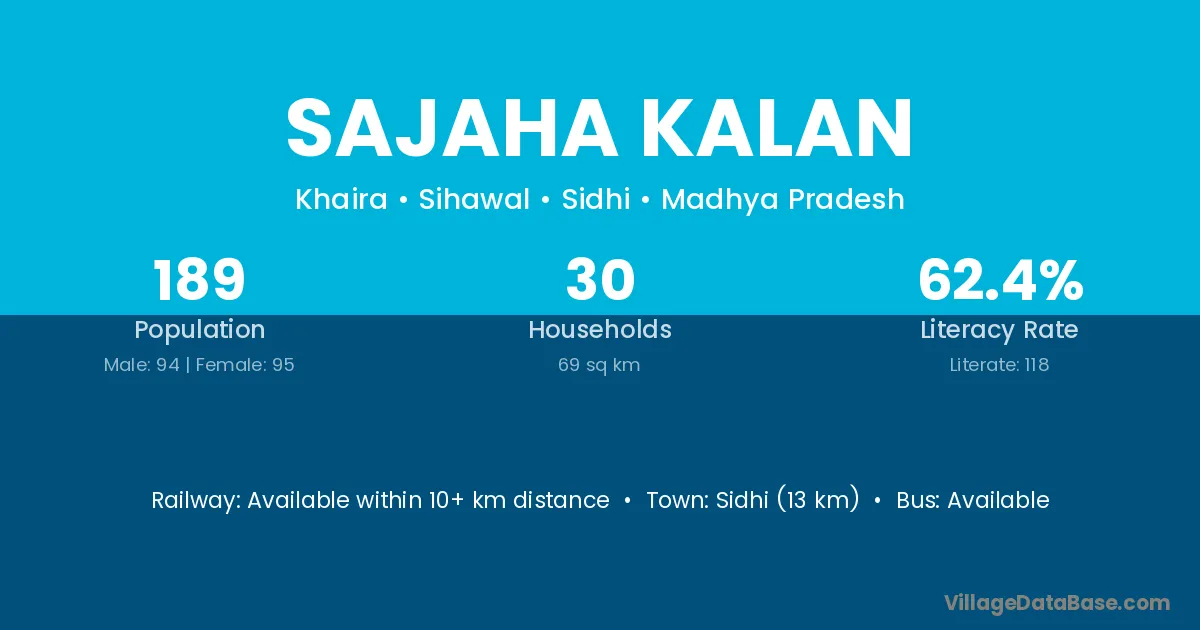 Sidhi (13 km) is the nearest town to Sajaha Kalan village for major economic activities and is located approximately 13 km away.