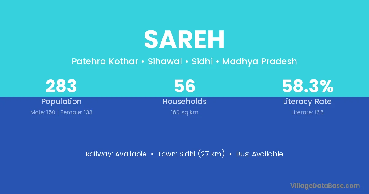 Sidhi (27 km) is the nearest town to Sareh village for major economic activities and is located approximately 27 km away.