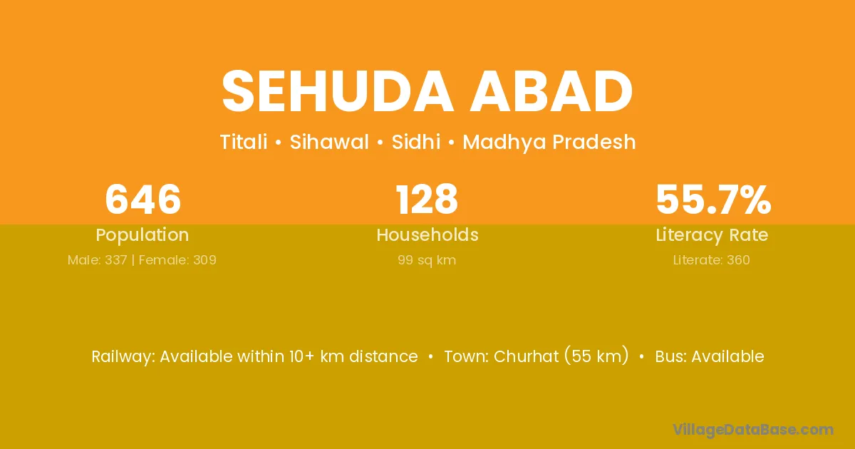 Churhat (55 km) is the nearest town to Sehuda Abad village for major economic activities and is located approximately 55 km away.