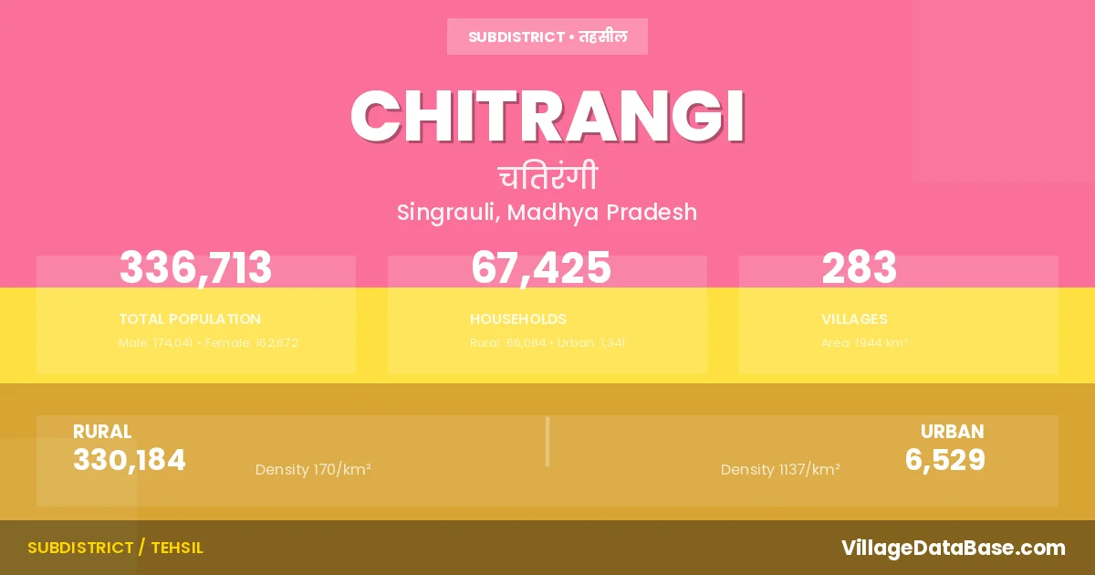 According to the 2011 census The total area of Chitrangi Tehsil is 1944 km², with a population of 336713 people. The population density is 173 inhabitants per square kilometre, and there are approximately 67425 houses in the sub district.
