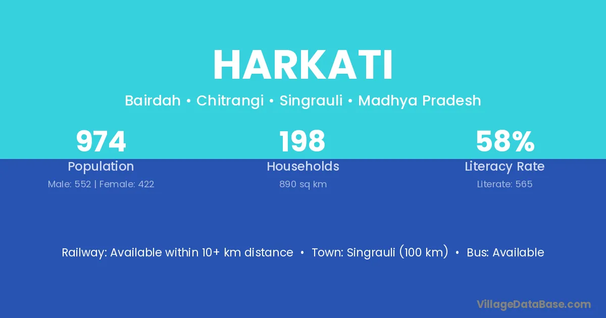 Harkati village has a total population of 974 people, of which 552 are males and 422 are females.