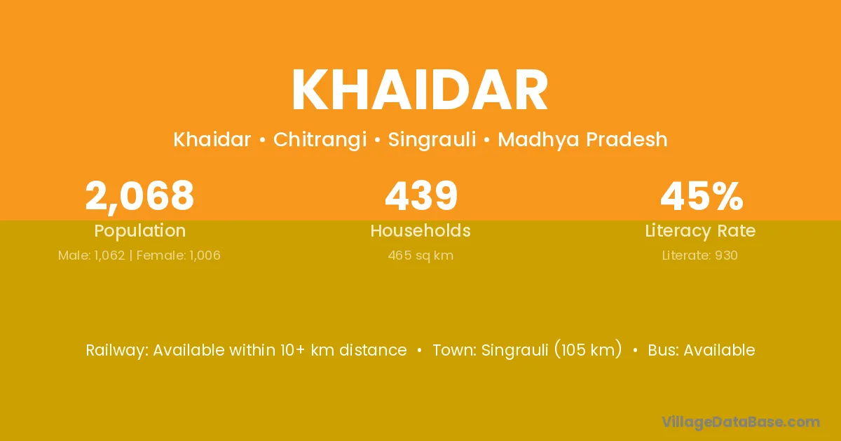 Singrauli (105 km) is the nearest town to Khaidar village for major economic activities and is located approximately 105 km away.