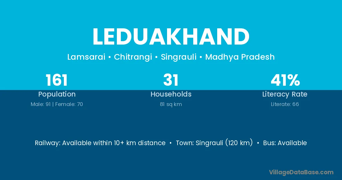 Singrauli (120 km) is the nearest town to Leduakhand village for major economic activities and is located approximately 120 km away.