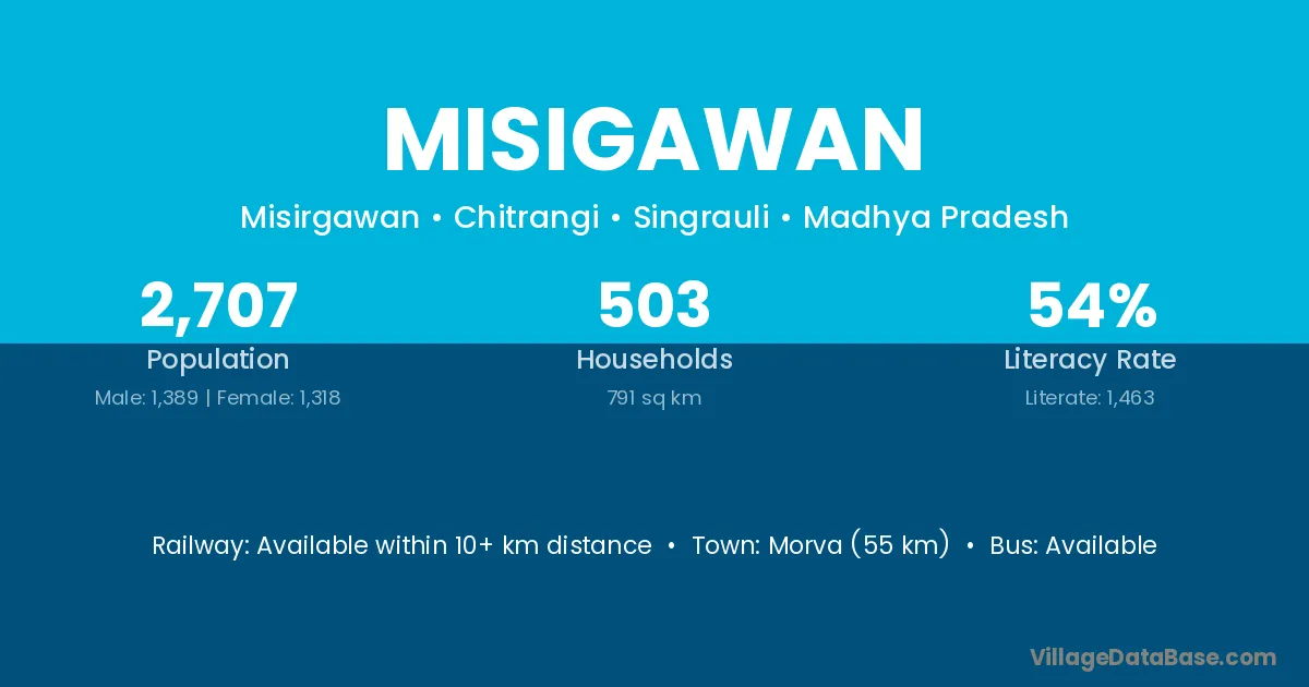 Misigawan village has a total population of 2,707 people, of which 1,389 are males and 1,318 are females.