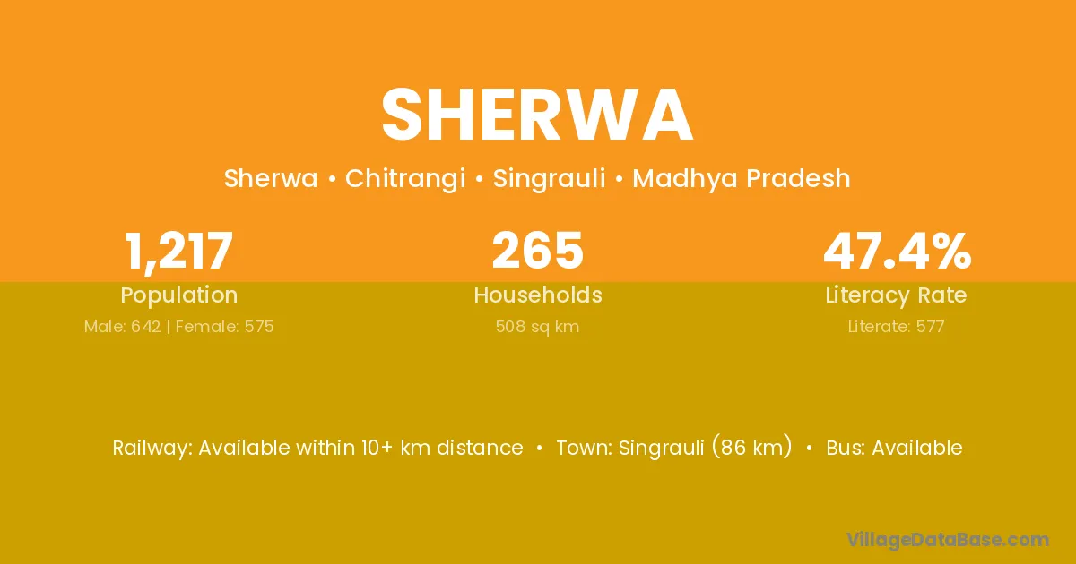 Singrauli (86 km) is the nearest town to Sherwa village for major economic activities and is located approximately 86 km away.