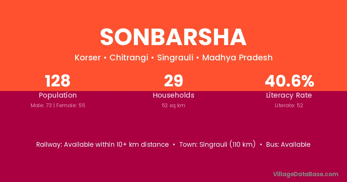 Sonbarsha village has a total population of 128 people, of which 73 are males and 55 are females.