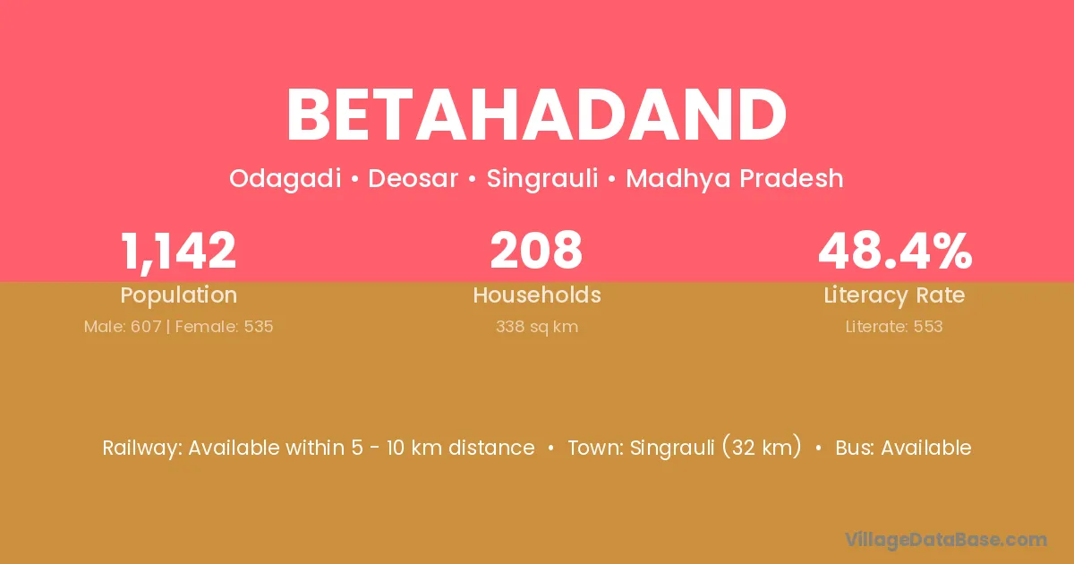 Singrauli (32 km) is the nearest town to Betahadand village for major economic activities and is located approximately 32 km away.