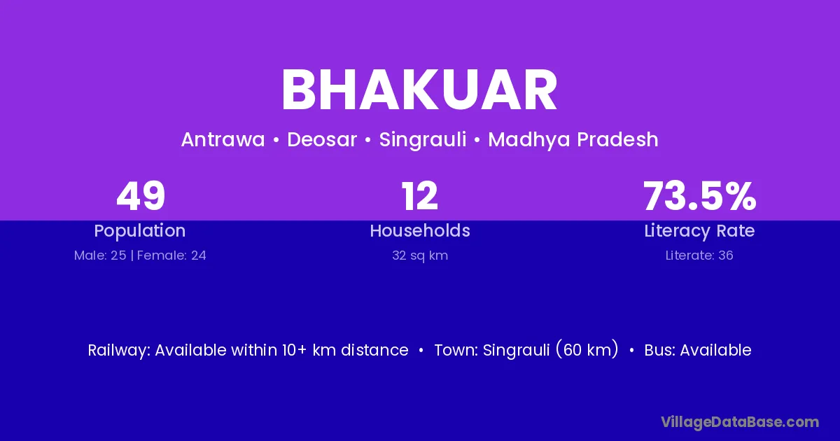 Singrauli (60 km) is the nearest town to Bhakuar village for major economic activities and is located approximately 60 km away.