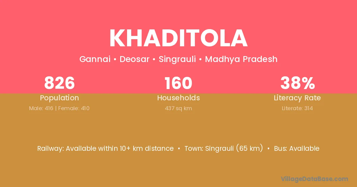 Khaditola village has a total population of 826 people, of which 416 are males and 410 are females.