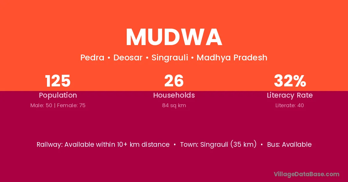 Singrauli (35 km) is the nearest town to Mudwa village for major economic activities and is located approximately 35 km away.