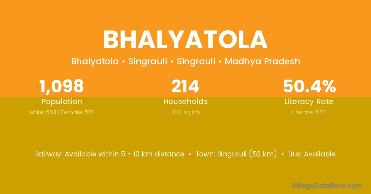 Bhalyatola village has a total population of 1,098 people, of which 583 are males and 515 are females.