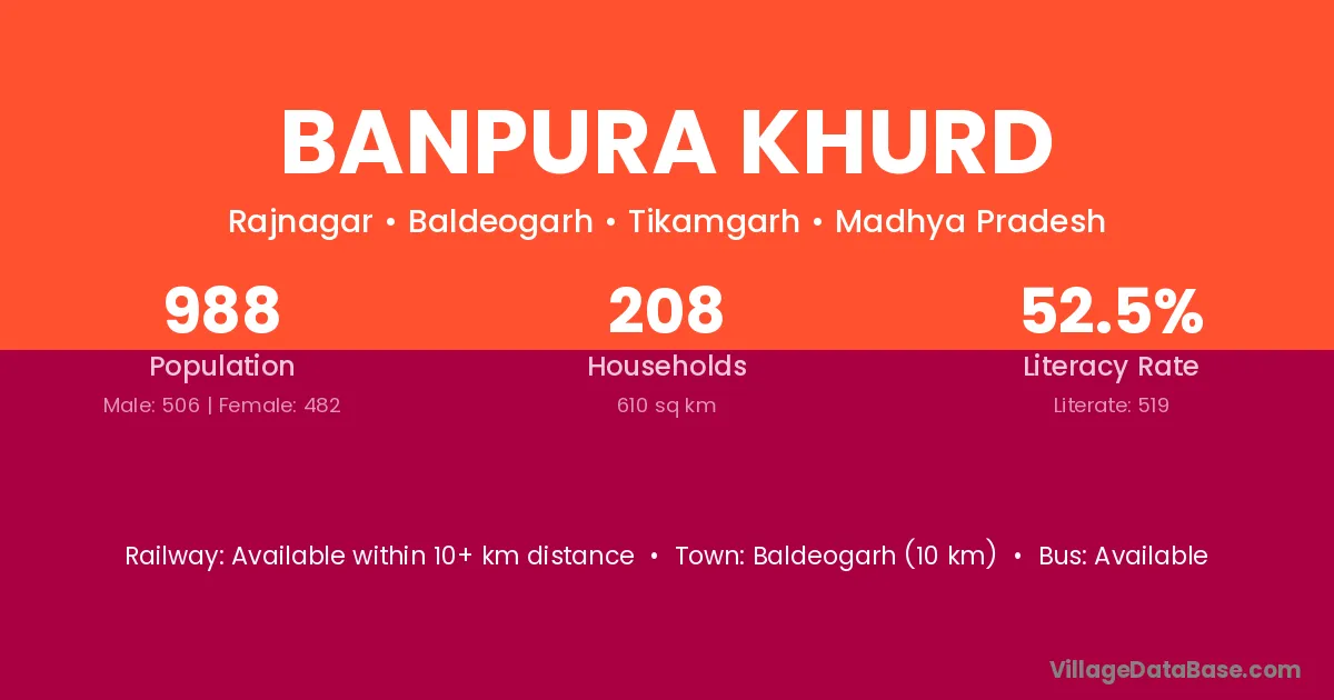 Banpura Khurd village has a total population of 988 people, of which 506 are males and 482 are females.
