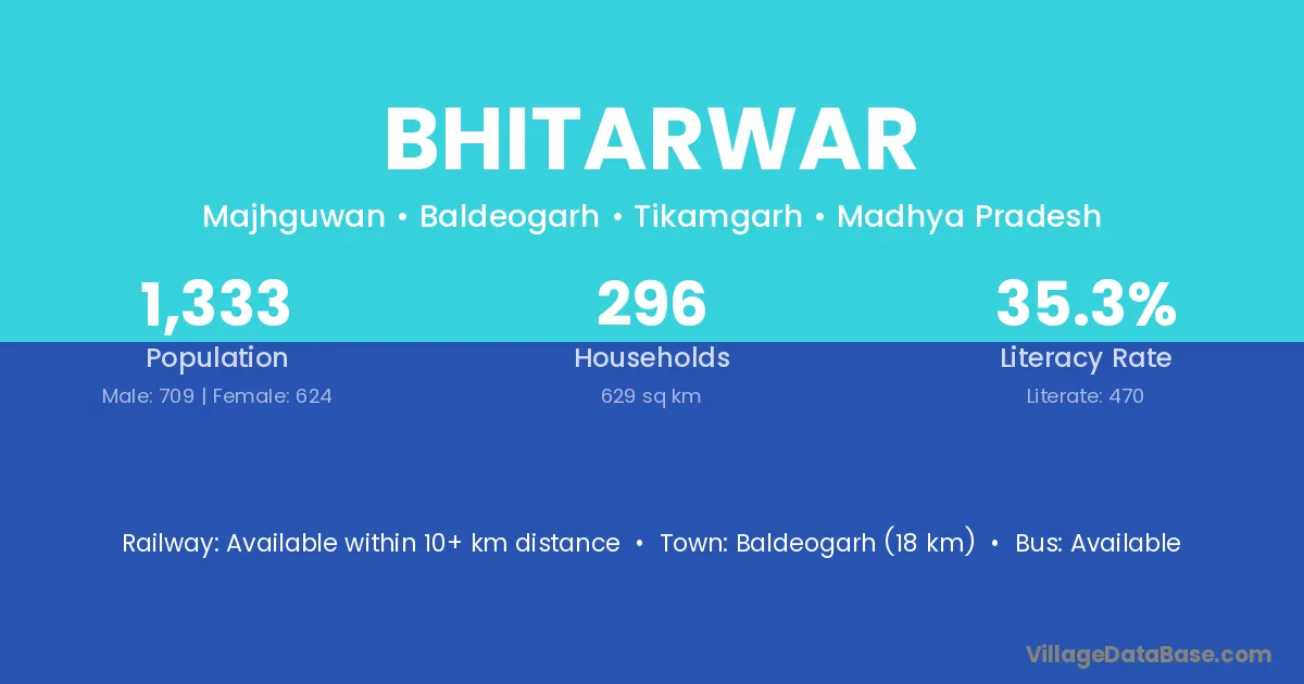 Baldeogarh (18 km) is the nearest town to Bhitarwar village for major economic activities and is located approximately 18 km away.
