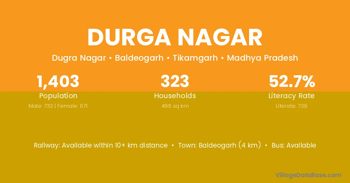 Baldeogarh (4 km) is the nearest town to Durga Nagar village for major economic activities and is located approximately 4 km away.