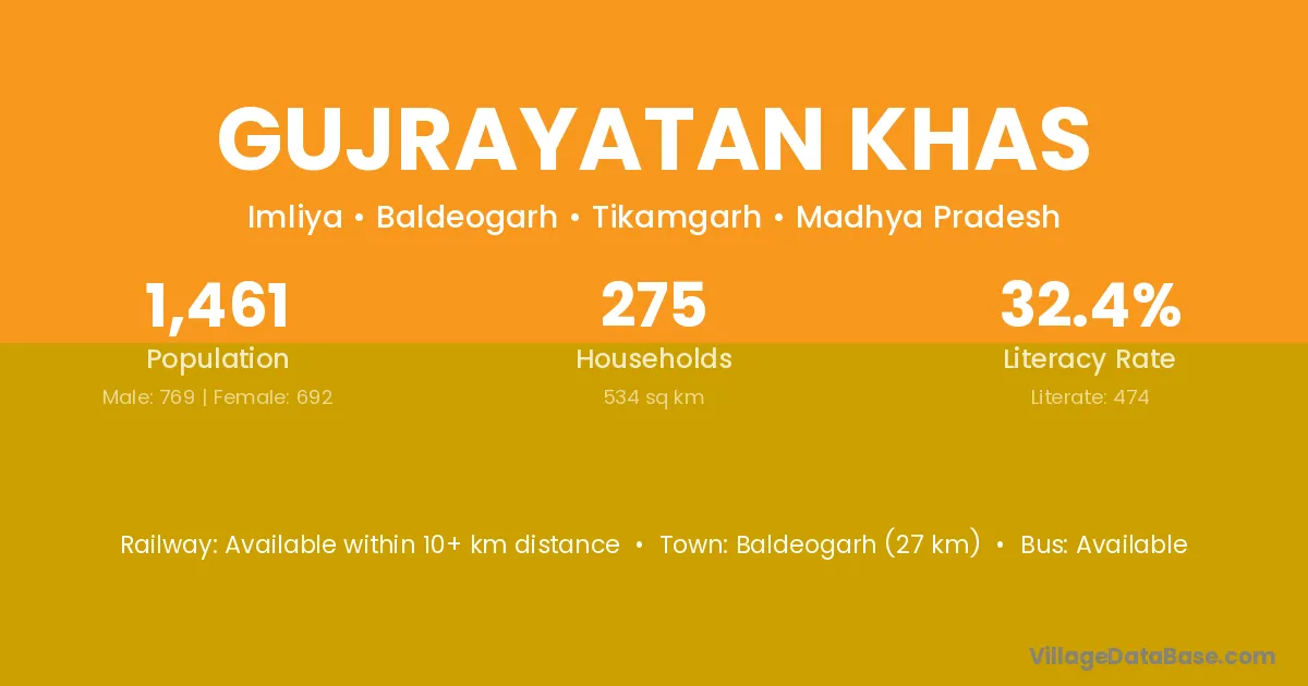 Baldeogarh (27 km) is the nearest town to Gujrayatan Khas village for major economic activities and is located approximately 27 km away.