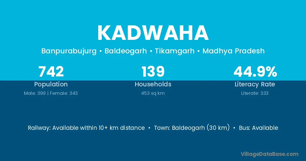 Baldeogarh (30 km) is the nearest town to Kadwaha village for major economic activities and is located approximately 30 km away.