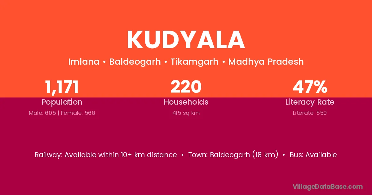 Baldeogarh (18 km) is the nearest town to Kudyala village for major economic activities and is located approximately 18 km away.