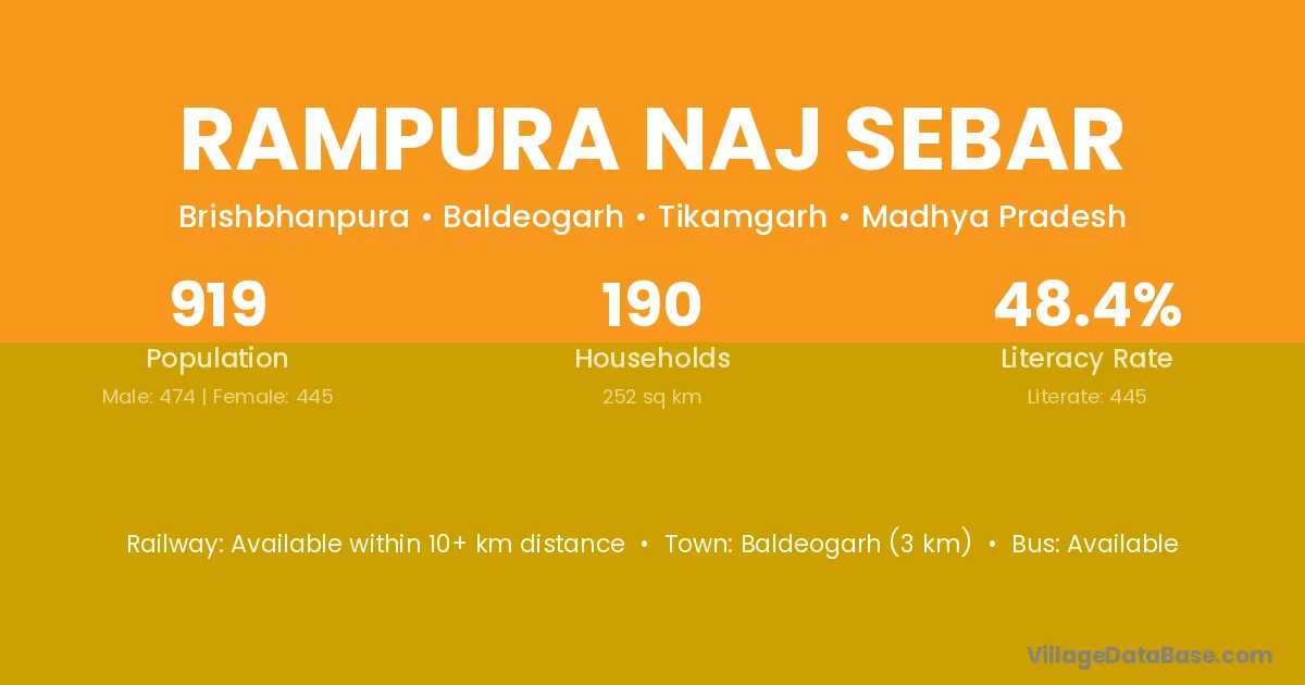 Rampura Naj Sebar village has a total population of 919 people, of which 474 are males and 445 are females.