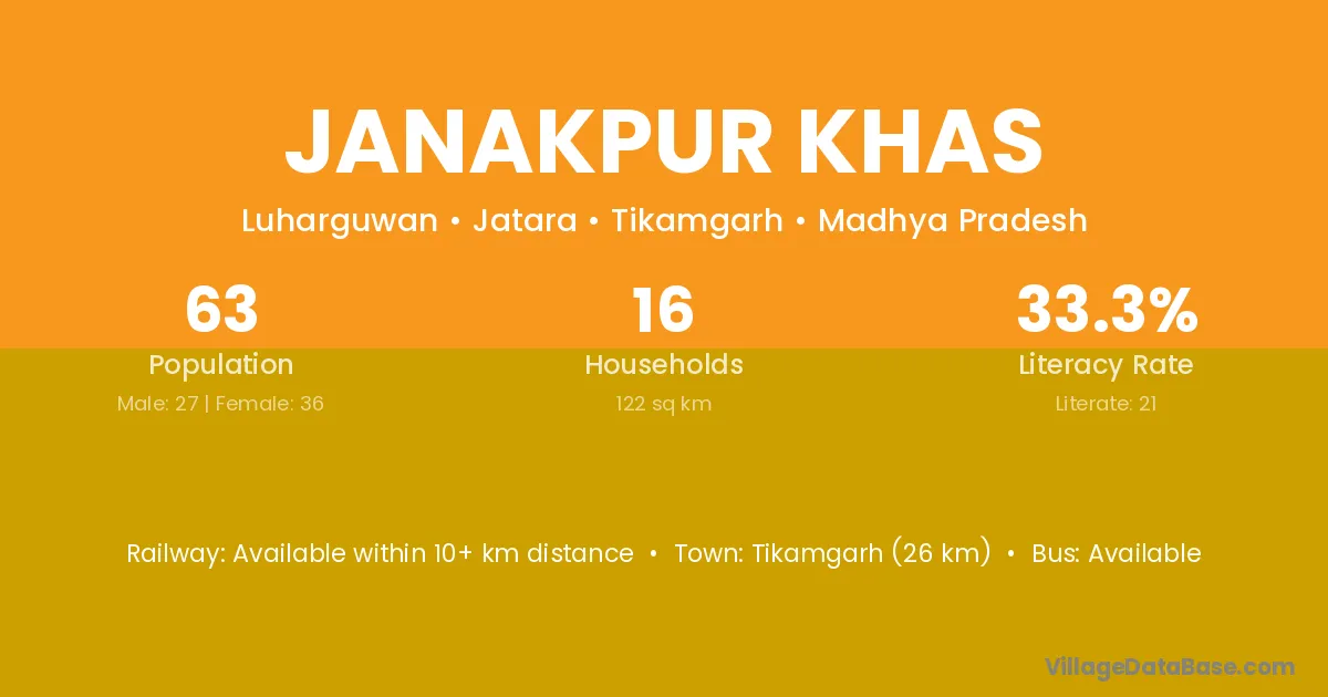 Tikamgarh (26 km) is the nearest town to Janakpur Khas village for major economic activities and is located approximately 26 km away.